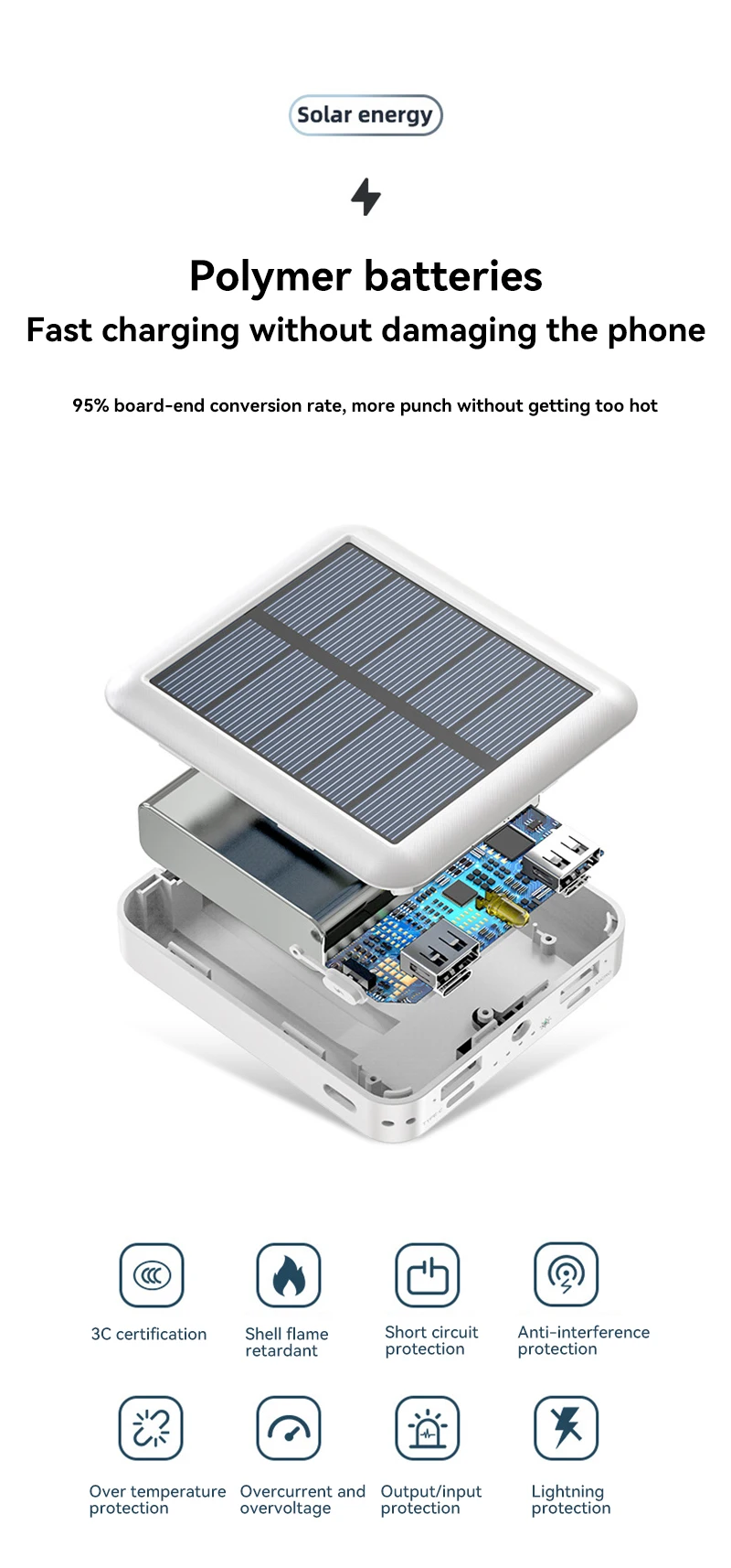 4. The portable battery charger adopts high-density Class A lithium polymer battery core, which is small in size and has a large capacity of 20000mAh. The portable mobile phone charger allows you to get rid of the anxiety about the remaining power of your mobile phone anytime and anywhere.