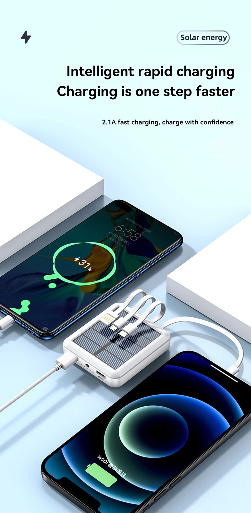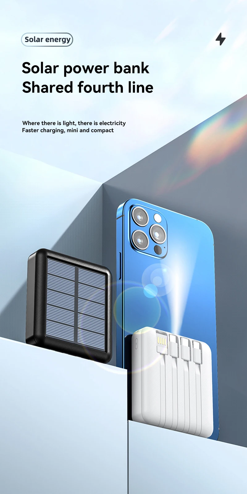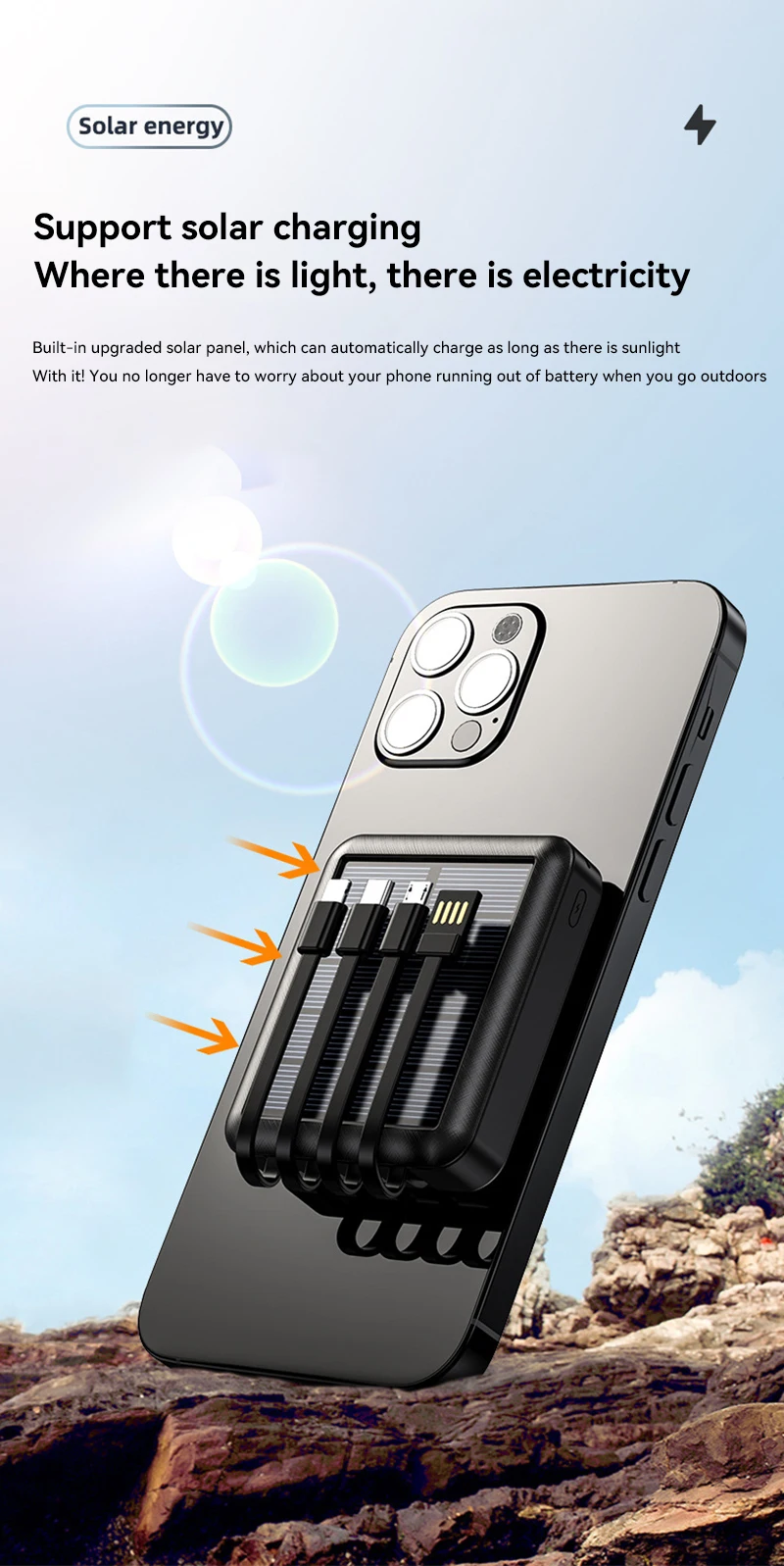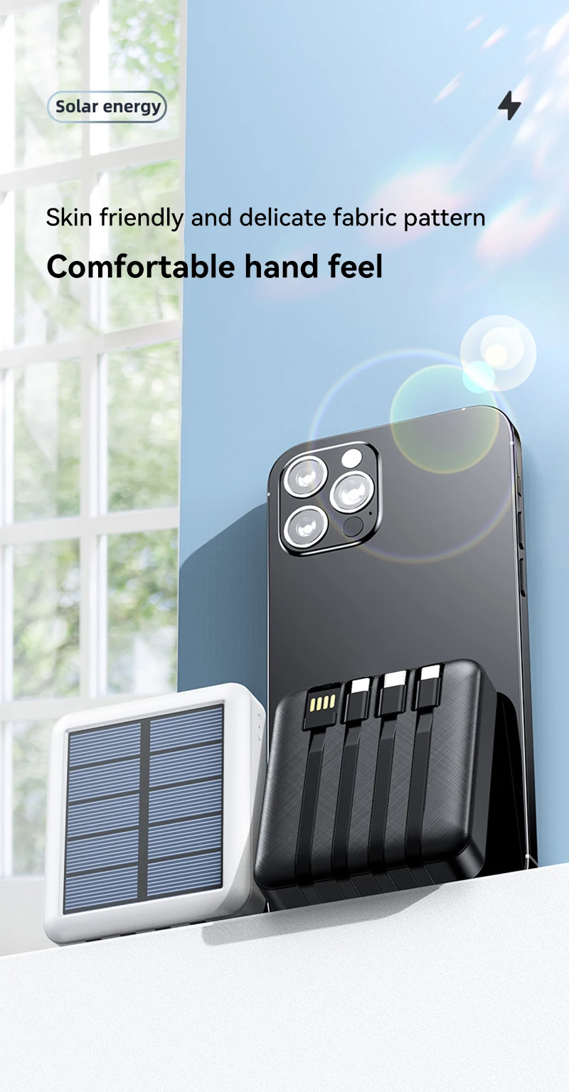 2. Mobile power supply, built-in IOS cable, C-type cable and Micor-type cable. With its compact appearance, the portable charger is easy to carry around.