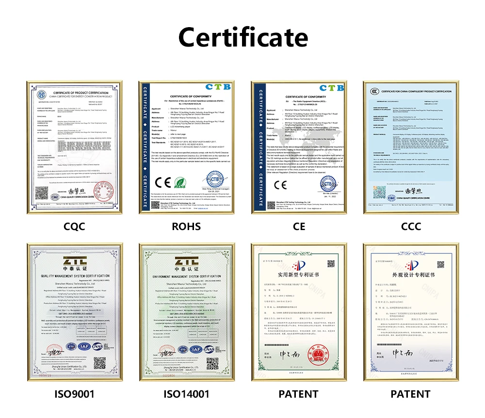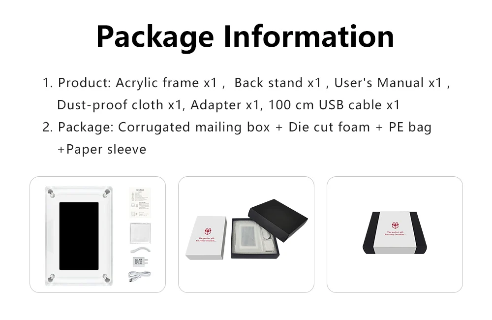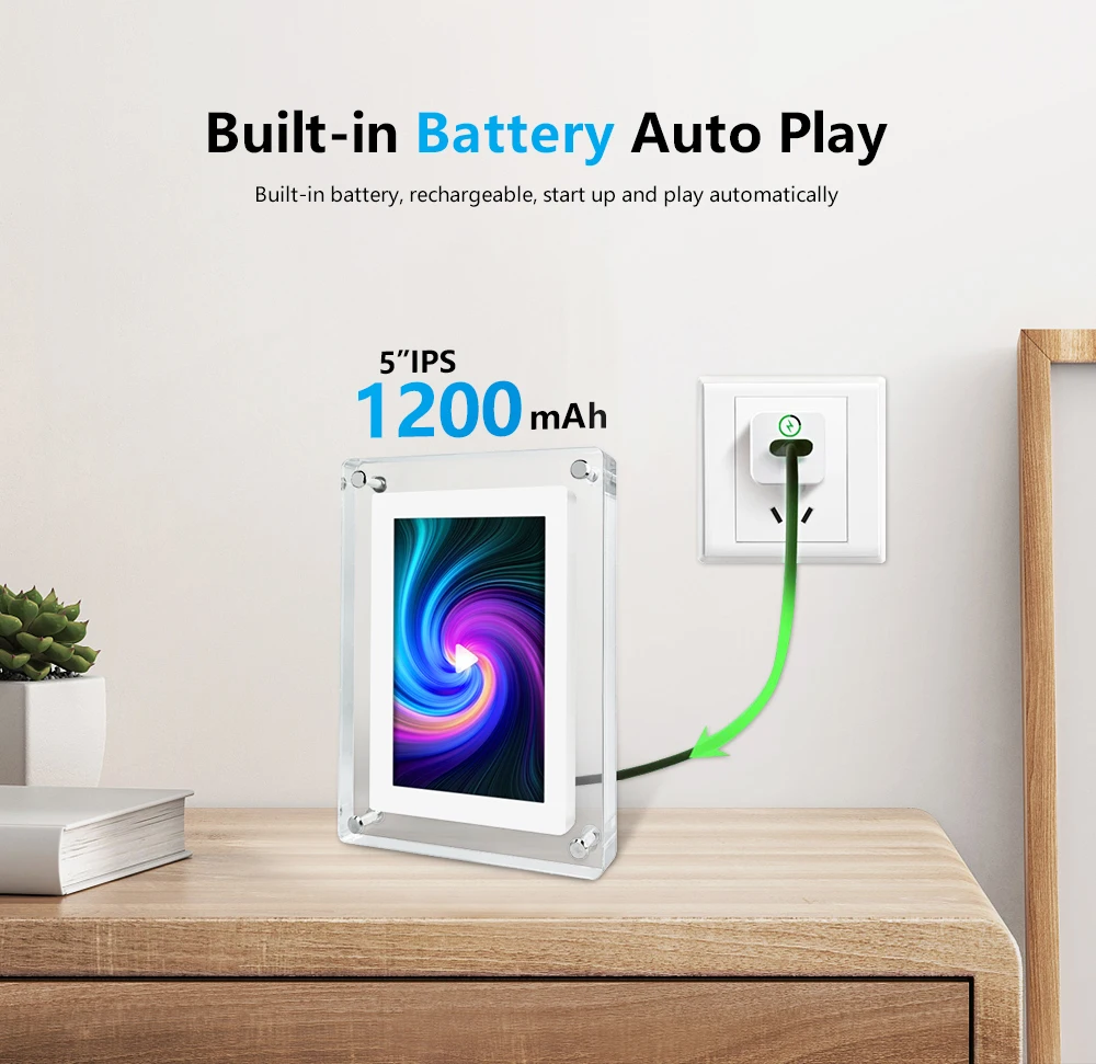 Feature Spec Screen 5 inch IPS screen (854x480) Brightness High brightness 300 nits Loudspeaker High quality loudspeaker(8Ω2W),multi media speaker for option Buttons On/off switch ; Play/pause(keep pressing 2+ seconds to be next file function) ;Volume control;please refer to the button icon on the back USB-C port Support both charge and data transfer Memory 4 GB by default,different memory size for option Battery 1200 mAh rechargeable lithium battery,larger battery size for option Video format All video format,MP4/Mov/Avi best(1920*1080 max) Picture format All picture format,Jpeg/Png/Bmp best (1920*1080 max) Work mode Plug in to play mode / Battery independent play mode Accessories Adapter (5V2A), USB-C cable, Back stand, Manual,Dustproof cloth